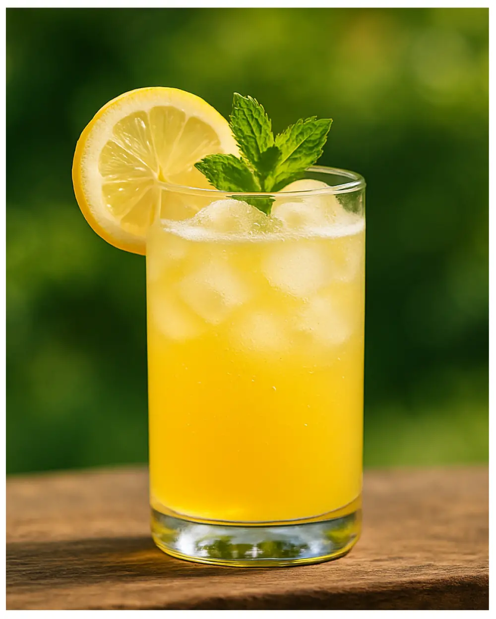 Decorează cu o felie de lămâie și o frunză de mentă proaspătă.