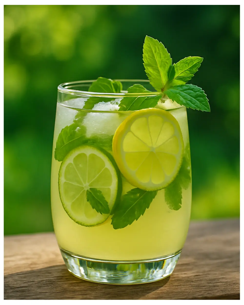 Amestecă bine și decorează cu felii de lime și frunze de mentă.