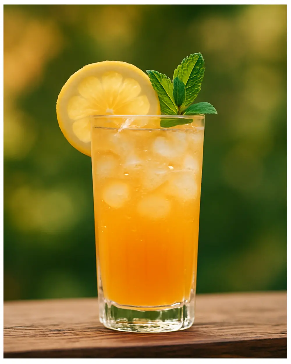 Decorează cu o felie de lămâie și o frunză de mentă.